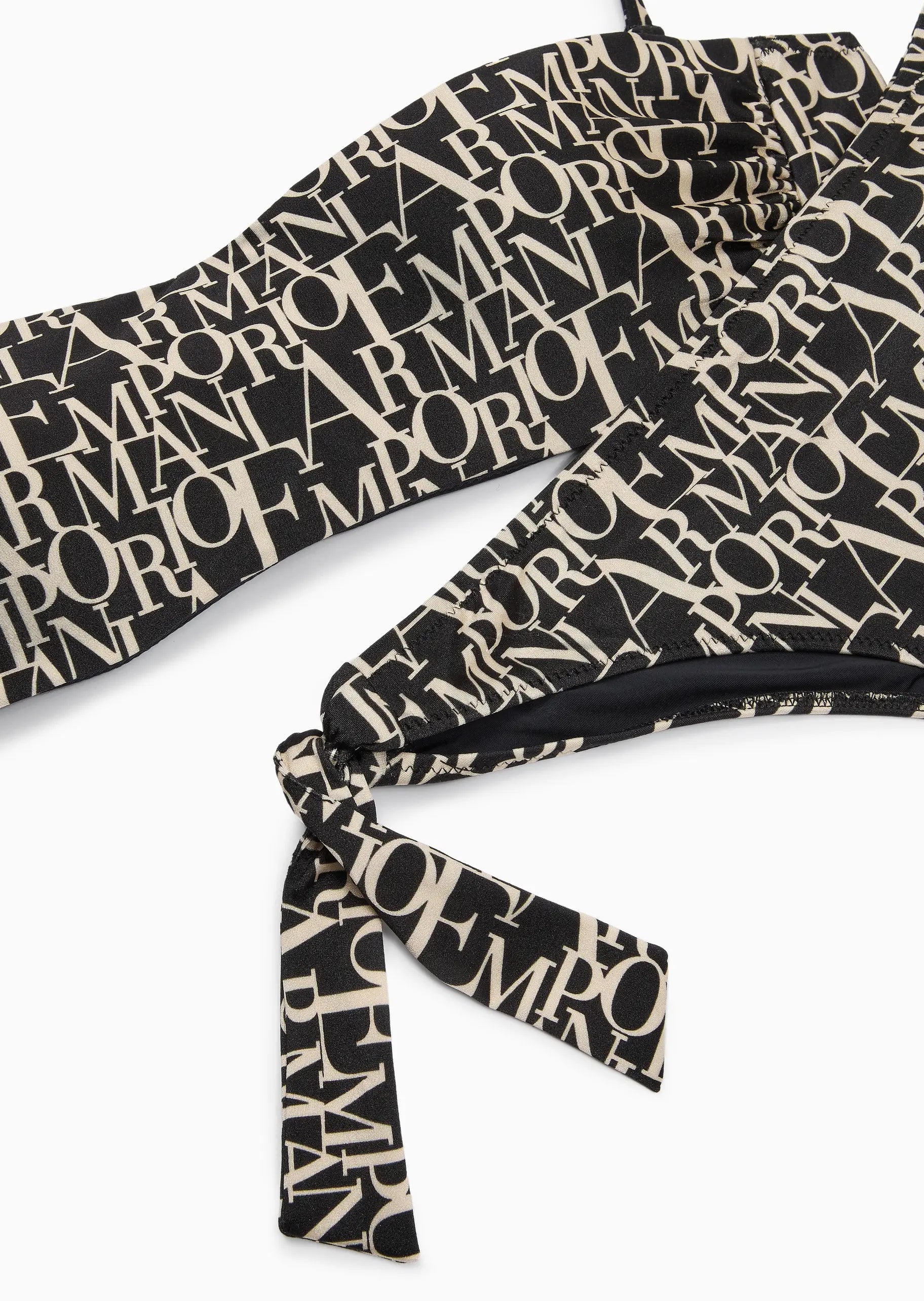Costume bikini composto da reggiseno a fascia con coppe removibili abbinato a slip modello brasiliana con lacci laterali. Impreziosito da stampa logo all over.