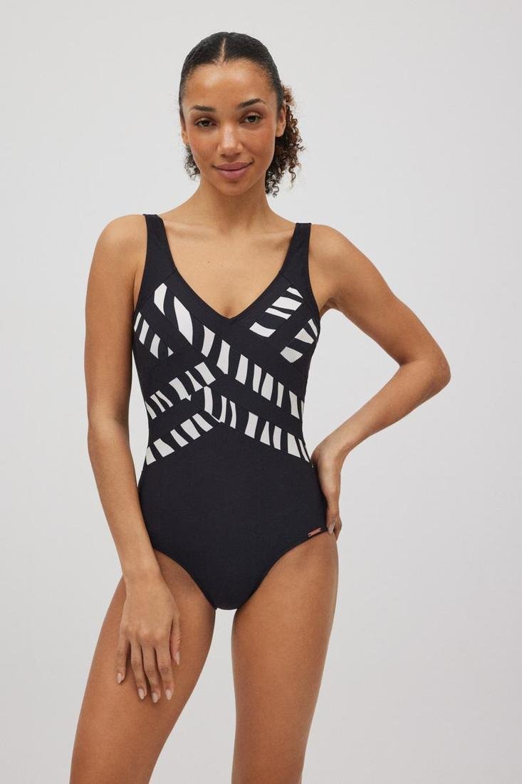 Costume intero da donna elasticizzato e modellante, con spalla larga e scollo a v di un nero intenso e stampa zebrata.