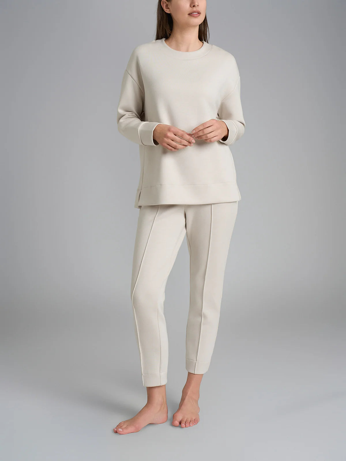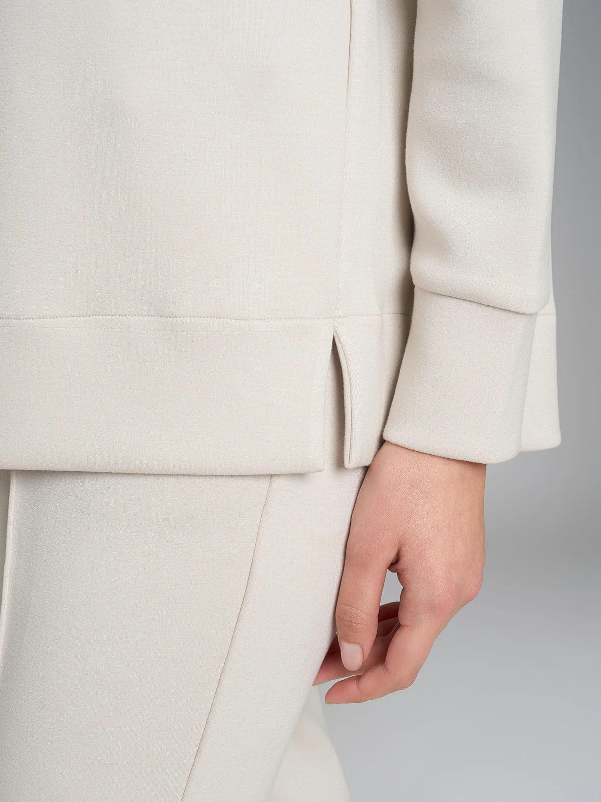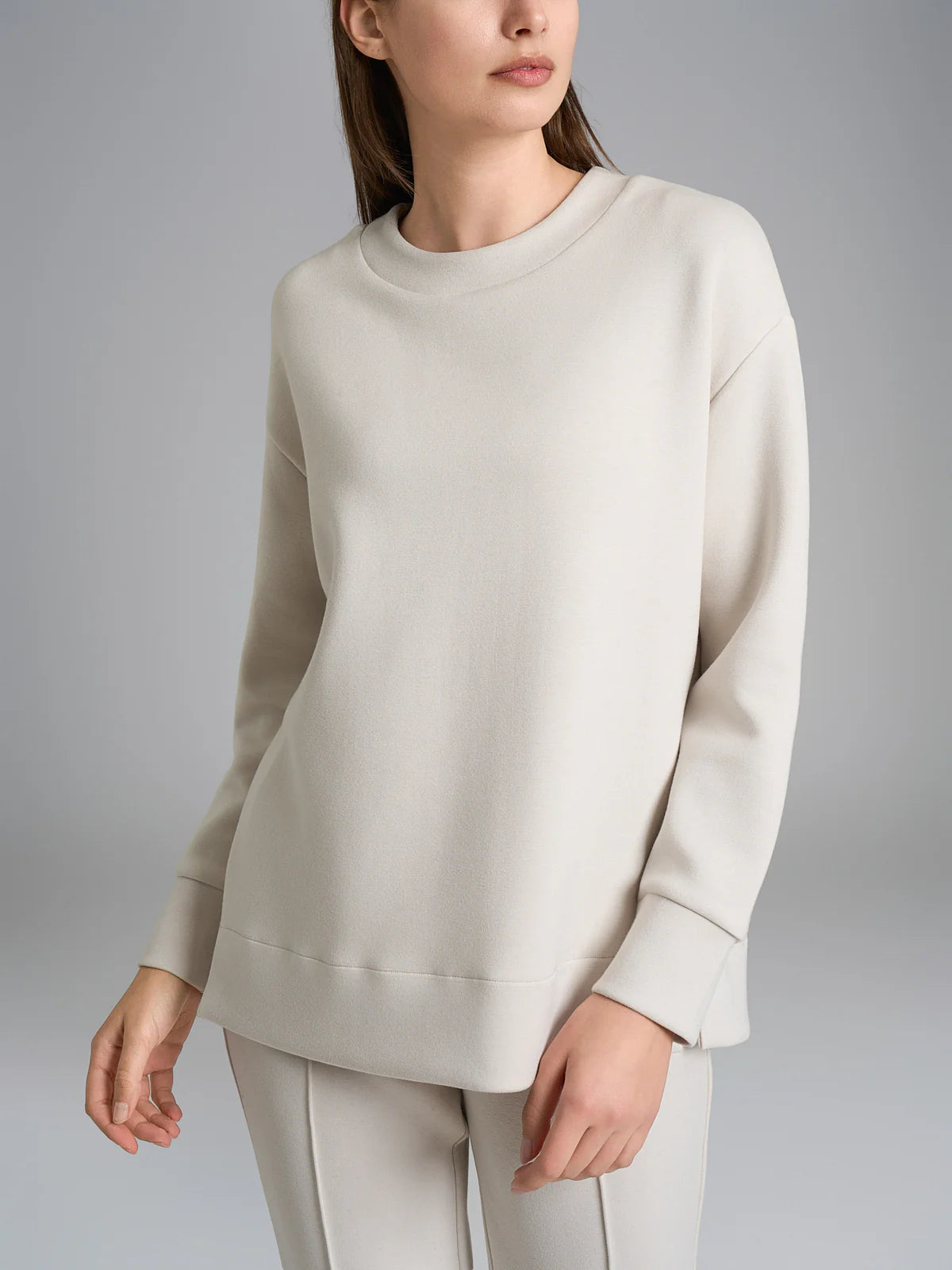 Felpa girocollo da donna in morbido tessuto Scuba. Caratterizzata dal girocollo classico, confortevole, che valorizza il design minimal del capo, rendendolo perfetto sia per il relax che per l’uso quotidiano. Le maniche lunghe con polsini assicurano una vestibilità comoda e funzionale, mentre i pratici spacchetti laterali facilitano l’indosso e aggiungono un tocco di dinamismo alla linea. A distinguere il capo sono le finiture curate, che esaltano lo stile sobrio ma raffinato della felpa. Realizzata in scuba, una maglia tecnica che unisce morbidezza, struttura e libertà di movimento. Parte della linea Homewear, questa felpa nasce dalla perfetta combinazione di benessere e stile: una giacchina confortevole ma ricercata, ideale per il tempo da dedicare a sé.