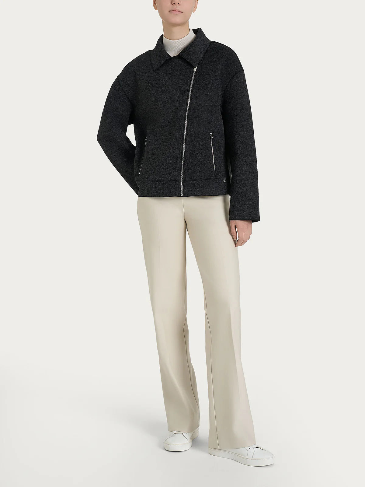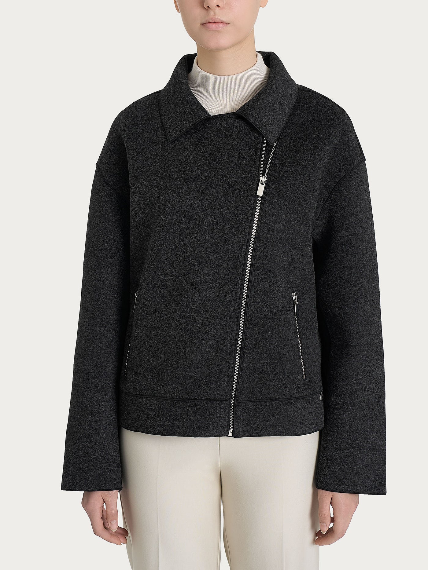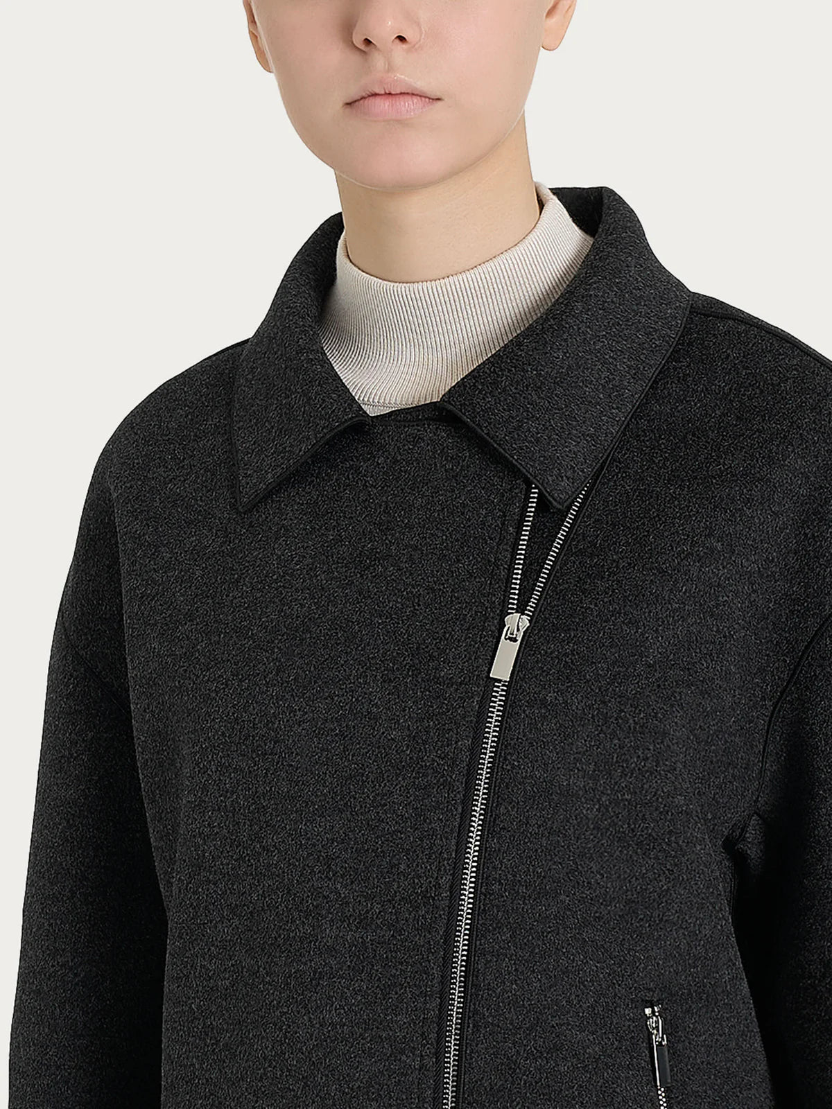 Giacca chiodo da donna in Vegan Wool. E' un'icona di stile senza tempo, simbolo di carattere e grinta con un tocco moderno. Caratterizzata dalla classica chiusura asimmetrica con zip e collo con revers, dona un look deciso e contemporaneo, perfetto per chi ama distinguersi. Le tasche laterali si chiudono con delle piccole zip per contenere piccoli oggetti e donare massima praticità. Realizzato in vegan wool, un’alternativa etica alla lana tradizionale, garantisce calore, morbidezza e resistenza, offrendo una texture piacevole al tatto e un look raffinato.