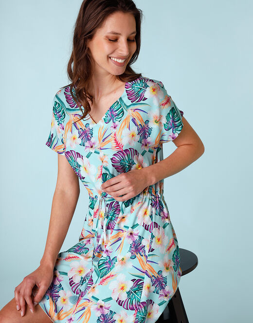 Lo scollo a V profondo e le maniche corte scese aggiungono un tocco di femminilità, mentre la coulisse regolabile in vita alta consente di personalizzare la vestibilità per un comfort ottimale. La forma morbida e fluida rende questo abito pratico e versatile, perfetto per chi cerca stile e comodità in ogni momento della giornata.