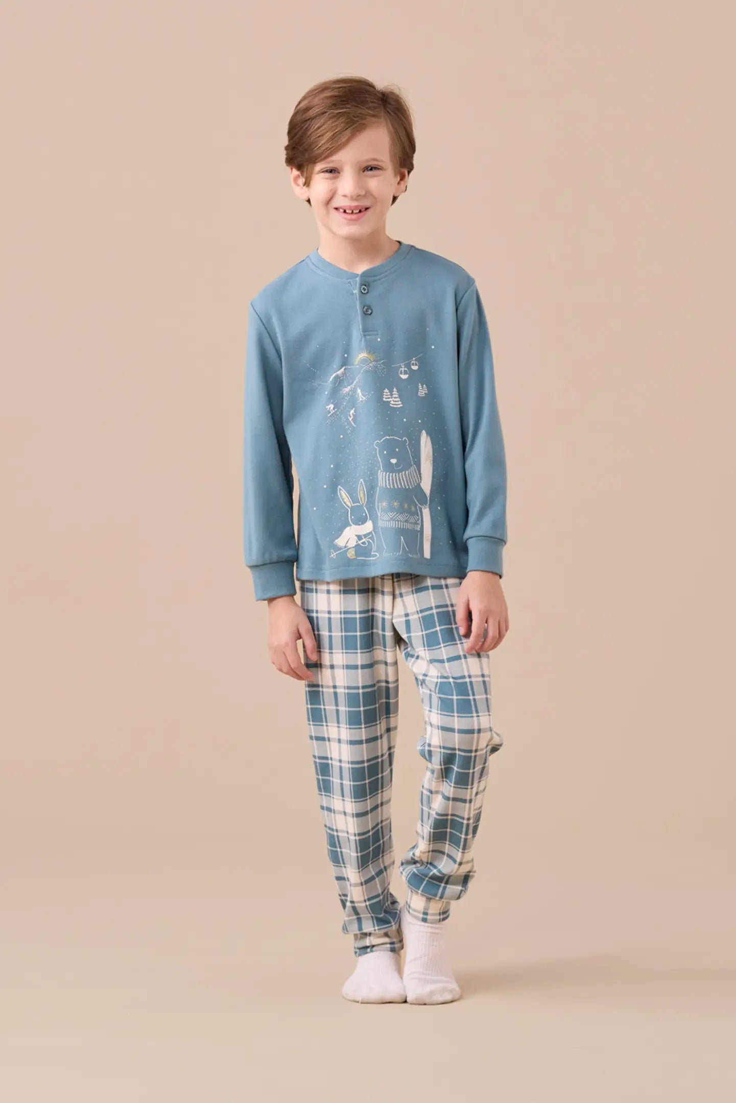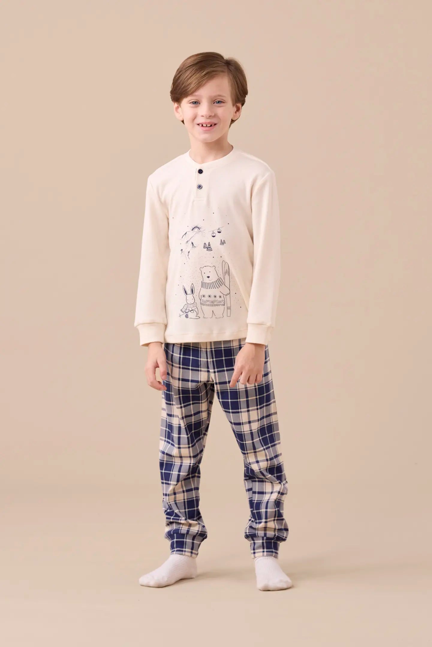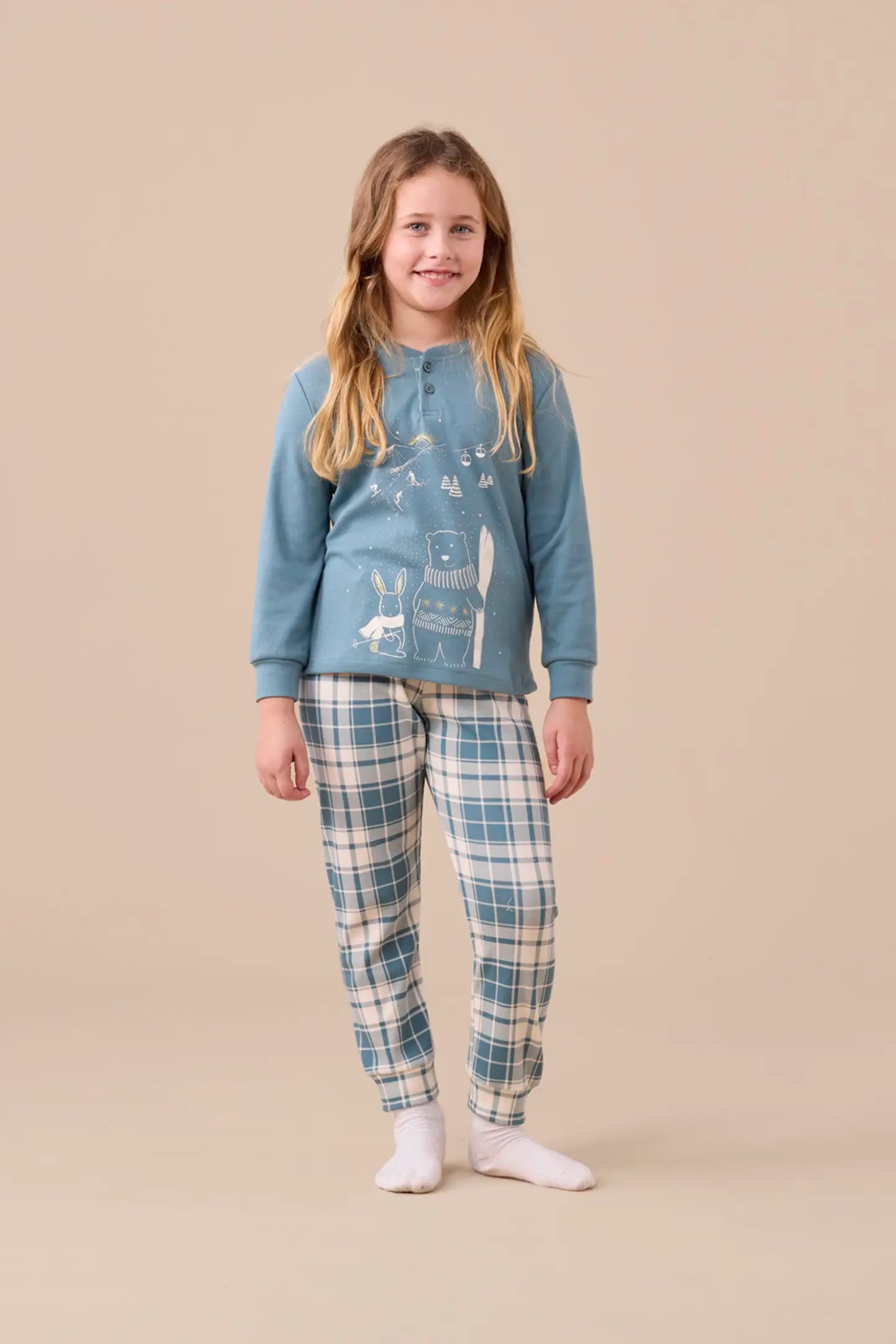 Pigiama in caldo cotone, pantalone con polsino, maglia con girocollo e bottoncini con fantasia invernale e pantalone con fantasia scozzese.