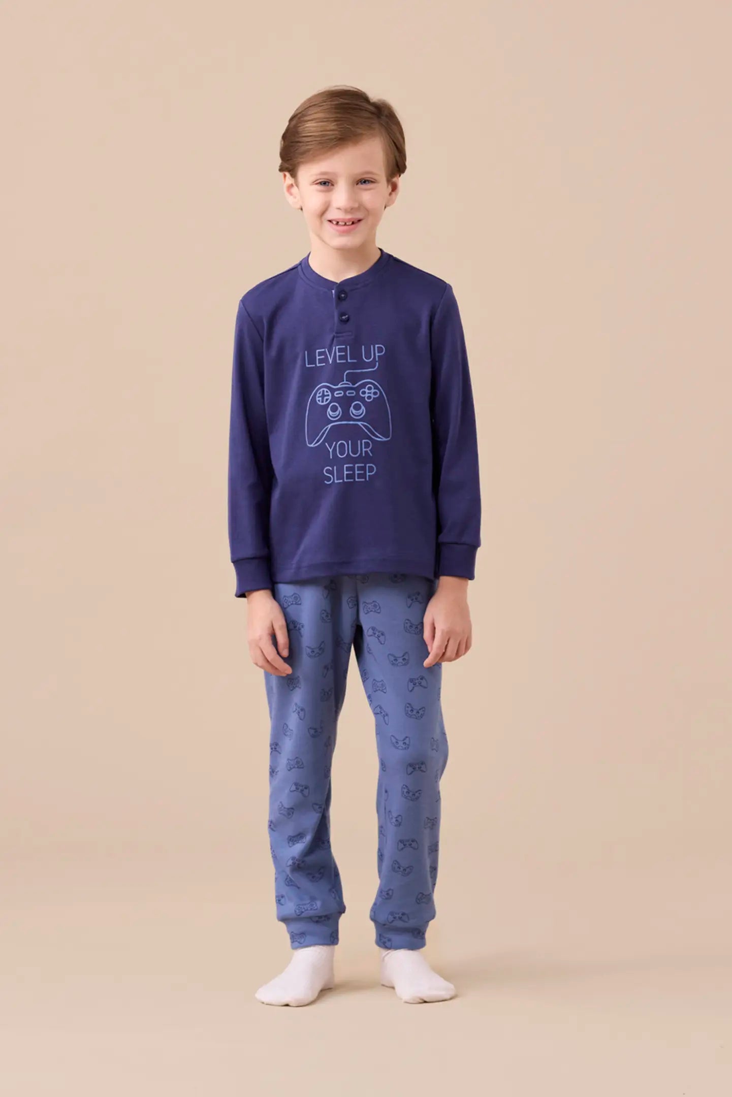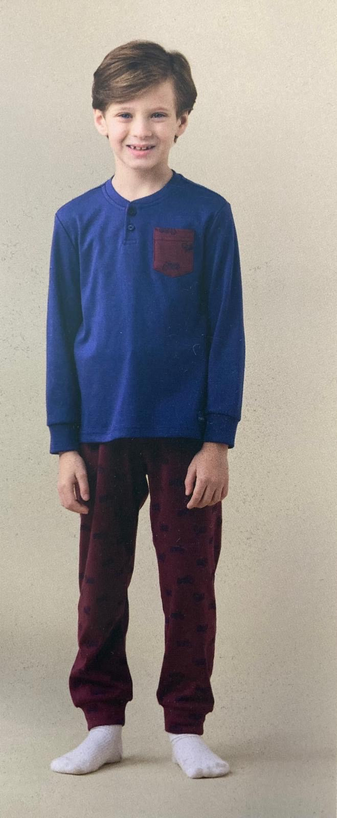 Pigiama bambino caldo cotone, pantalone con polsino, blu navy con blu avio con fantasia di joystick e blu navy e bordeaux con fantasia di moto.