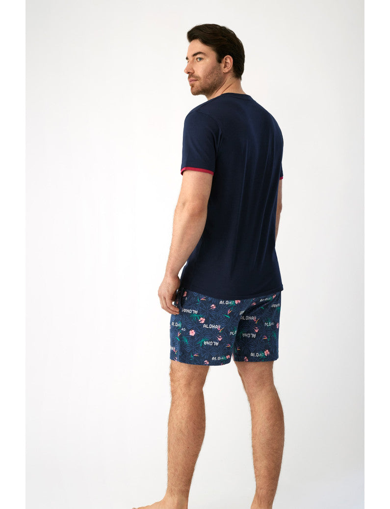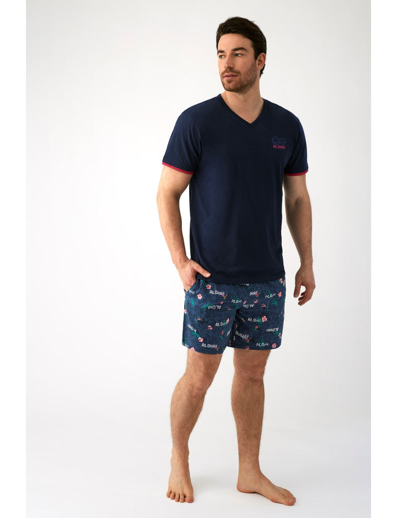 Pigiama a maniche corte con polsini 100% cotone, maglietta blu navy abbinata a pantaloni stampati.