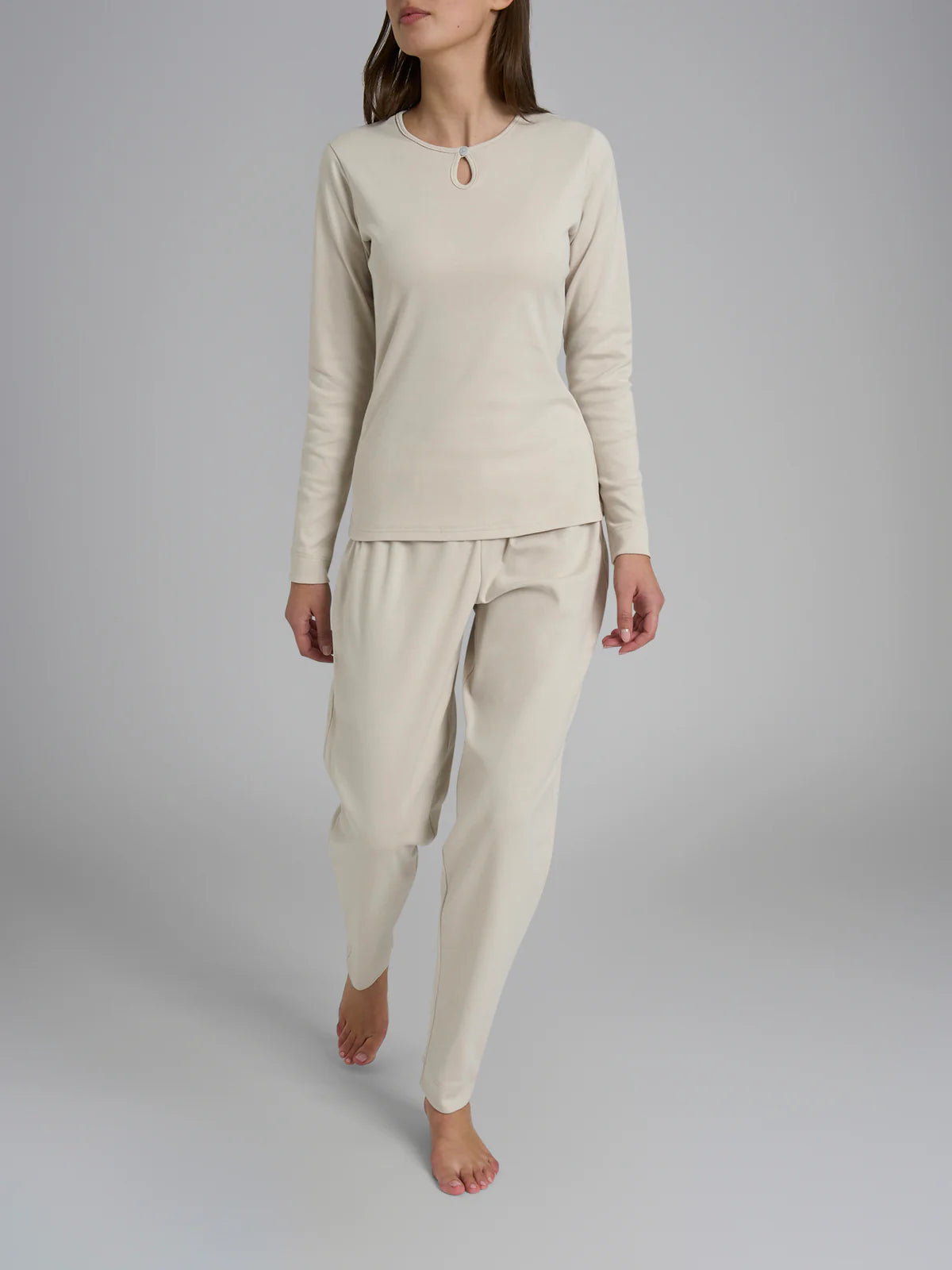 Pigiama donna con manica lunga con scollo serafino e pantalone lungo con polsino.