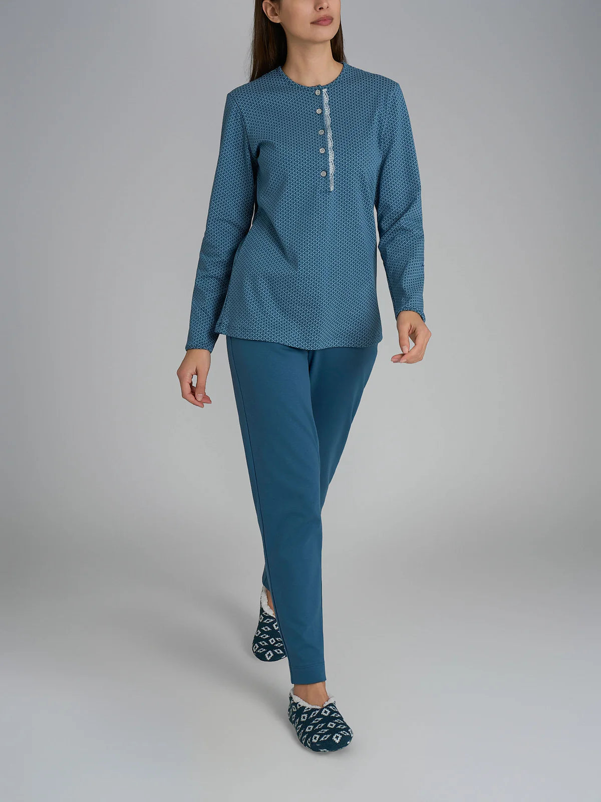 Scegli il comfort e lo stile unico del nostro pigiama da donna Ragno. Composto dalla casacca con il suo elegante collo a serafino a cinque bottoni e la manica lunga definita da un piccolo bottone sui polsi che ne facilitano l’indosso. La casacca, in base al colore, è definita da una fantasia cravatier e a check e da un elegante pizzo che delinea con eleganza l’apertura della casacca. Il pantalone a tinta unita con vestibilità regular dona comfort e crea un abbinamento elegante. Realizzato in caldo cotone interlock, questo pigiama garantisce una piacevole sensazione di morbidezza e calore. Caldo e avvolgente, questo capo è l’ideale per le serate fredde: un connubio perfetto tra stile classico e comfort avvolgente. Con le fantasie check e cravatier è una scelta perfetta per chi apprezza un’estetica curata nei dettagli, che spazia dal fascino del cravatier alla calda tradizione grafica del check.
