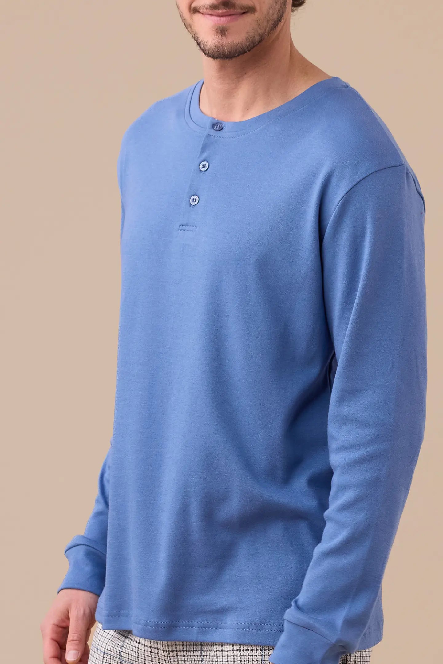 Pigiama uomo invernale in caldo cotone, top di colore unito con collo a tre bottoni e pantaloni in stampa scozzese con polsino.