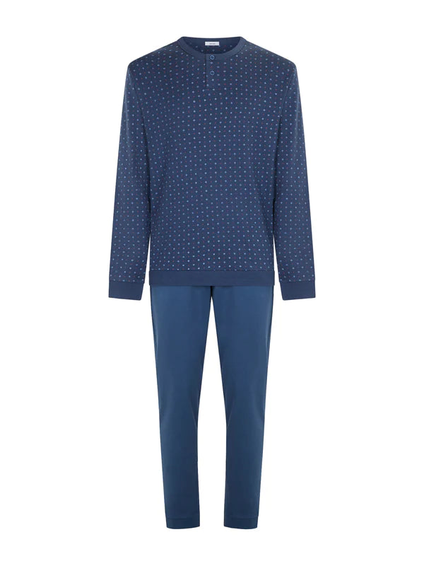 La casacca a serafino presenta una stampa cravatier, che aggiunge un tocco di eleganza e raffinatezza al capo. La fascia sul fondo e i polsini in tinta unita a contrasto completano il look con un tocco di modernità. I pantaloni, anch'essi in tinta unita, presentano polsini alla caviglia per una vestibilità comoda e pratica. Questo pigiama offre un mix di comfort e stile, perfetto per le serate rilassanti a casa o per una notte di sonno tranquilla. Realizzato in caldo cotone interlock, assicura una sensazione morbida e piacevole sulla pelle, garantendo un comfort ottimale.