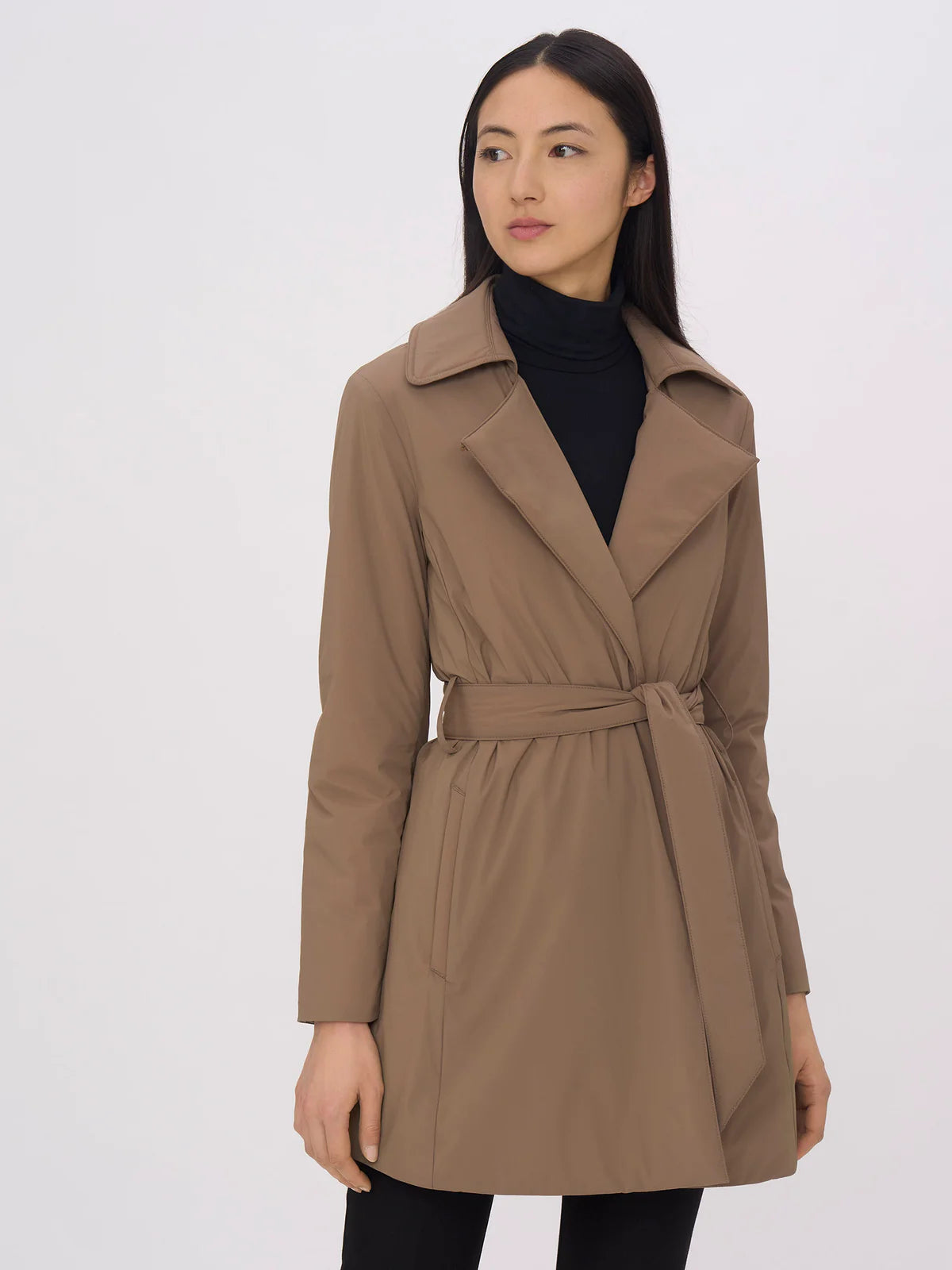 Trench invernale con imbottitura in lana da donna, chiusura con cintura, collo classico con revers, tasche laterali a filetto.