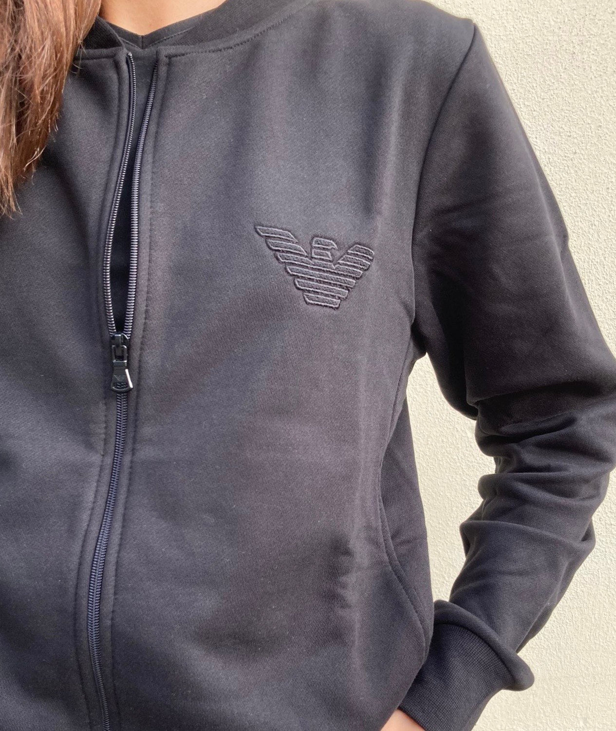 Tuta donna emporio armani composta da una felpa con zip e senza cappuccio con logo laterale altezza petto, abbinata ad un pantalone con elastico in vita e ampio, con una vestibilità morbida adatta a tutte le forme.